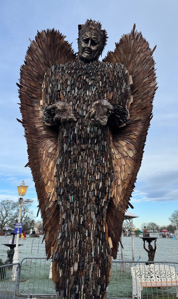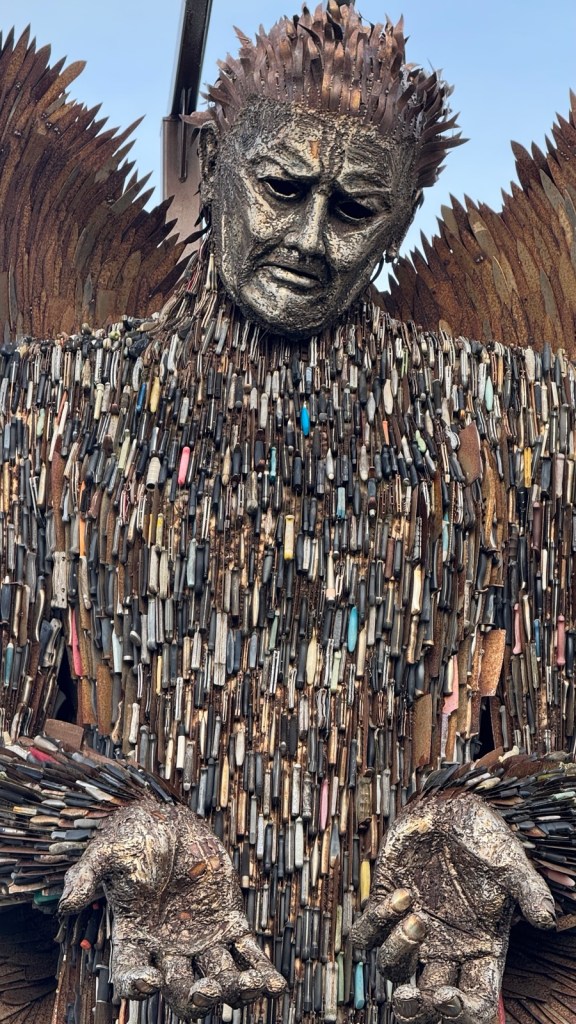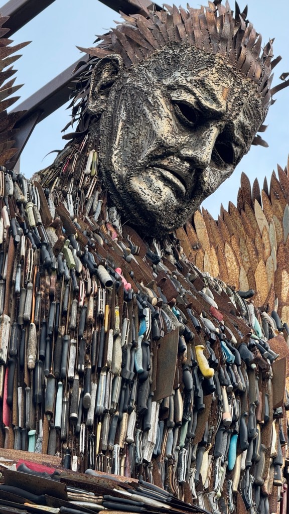 It’s an angel made out of over 100,000 knifes which have been surrendered to the police or the police have confiscated from all over the country. it symbolises the devastating impact of knife crime.