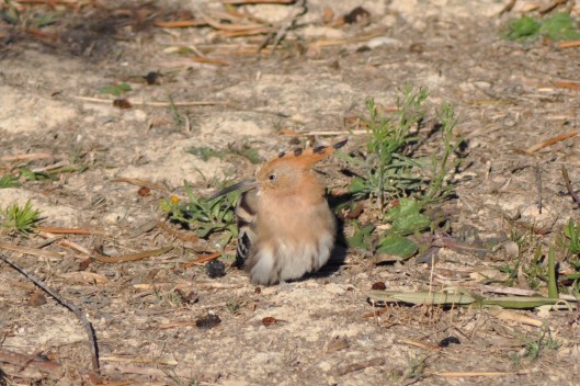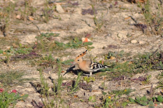 Over the back of our pitch here are olive trees and barren ground. The amount of different birds I see in there is amazing. Blackbirds, sparrows, blackcaps, redstarts, Black redstarts, Siskin, and even on rare occasions a hoopoa. the other day when we came back from the shop, sat on the fence singing away was what looked like a white sparrow, grabbed the camera but to late he had flown away. The next day he was back, hopping about on the ground eating. I managed to get some photos of him this time and relized he was a canary and must have escaped from his cage. Going back to the Hoopoo, no we’re not talking about the dogs and Chinese shop again. HOOPOO he did that one over there, no not him hepoo no Hoopoo I don’t know Hoopoo. The Hoopoa is a mistle thrush sized bird found in Europe and sometimes seen in the south of England in the spring while on there migration course. Beautifully coloured with a long bill and a crest on there head which stands up when they are excited. Wanted to get a photo of one but you don’t see them that often. Well the other day one landed and was searching for food on the ground, they eat spiders and grubs etc and dig in the ground with there long bill. Got the camera out and stood very still and reeled off a few shots. He was very obliging coming even closer and at one point even sitting down in the sun for a small nap. He was not very excited about having his photo taken though as he never raised his crest.