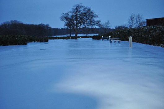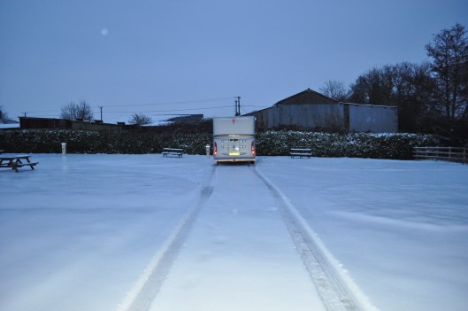 We had already arranged with the campsite just outside Poole that we would be late. No problem they said you know where to go. We got off the ferry to very snow covered ground, and slowly but surely drove to the campsite. It’s only about 5 miles away but the roads were really bad. No traffic about, not surprised really, everybody was tucked up in the warm. Not good to be out in a car let alone a five ton 30 ft motorhome. Nikki never said a lot from the dock until the campsite entrance. No one had been on the campsite so it was just like a blanket of snow, so as I drove along through the snow towards our pitch rounding a bend and onto our pitch leaving only tyre marks behind us. Engine off plugged into the electric and off to bed. The next morning and looking out the window was so weird. It had snowed, then rained, and then froze so it looked like a ice rink out there.