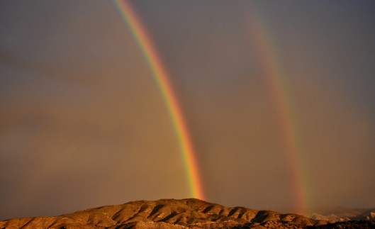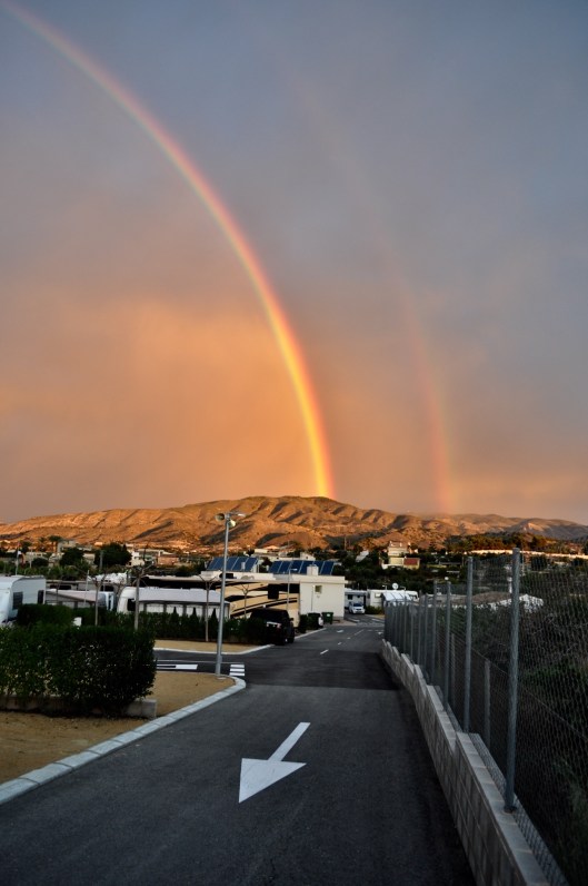 The mountains in the distance on one side of us change colour with all the different conditions. Sometimes just stark dark mountains but still beautiful. The best time and colour is in the morning when the sun comes up and shines on them, they change from pinkish, through to yellow, red etc. The other morning the sun was coming up but over the mountains were very dark clouds, really heavy dark clouds full of rain. The sky was clear in the east where the sun was coming up. As the sun rose it cast its light on the mountains a fantastic rainbow appeared. The colours were fantastic.
