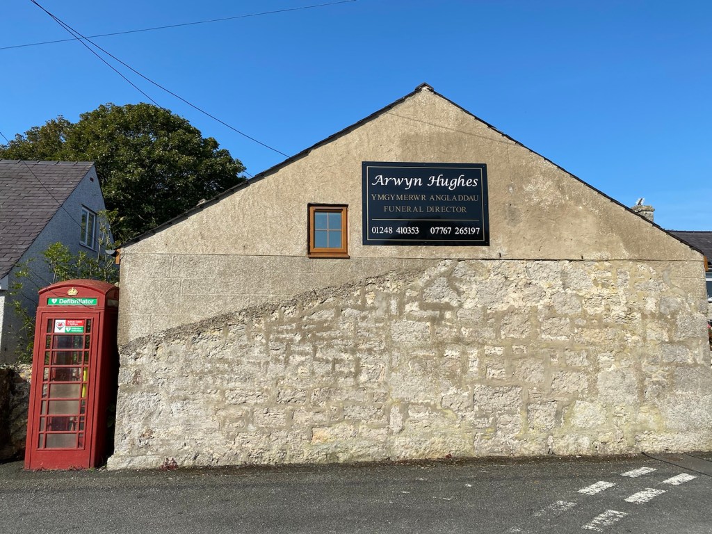Monday morning was bright and sunny so decided to walk down to the small beach/cove and have a lunch in the beach cafe. Saw this funeral directors on the way with an old village phone box now converted to house a defibrillator a thing a lot of villages do. I could not help wondering if the funeral directors lock the phone box so they get more business.
