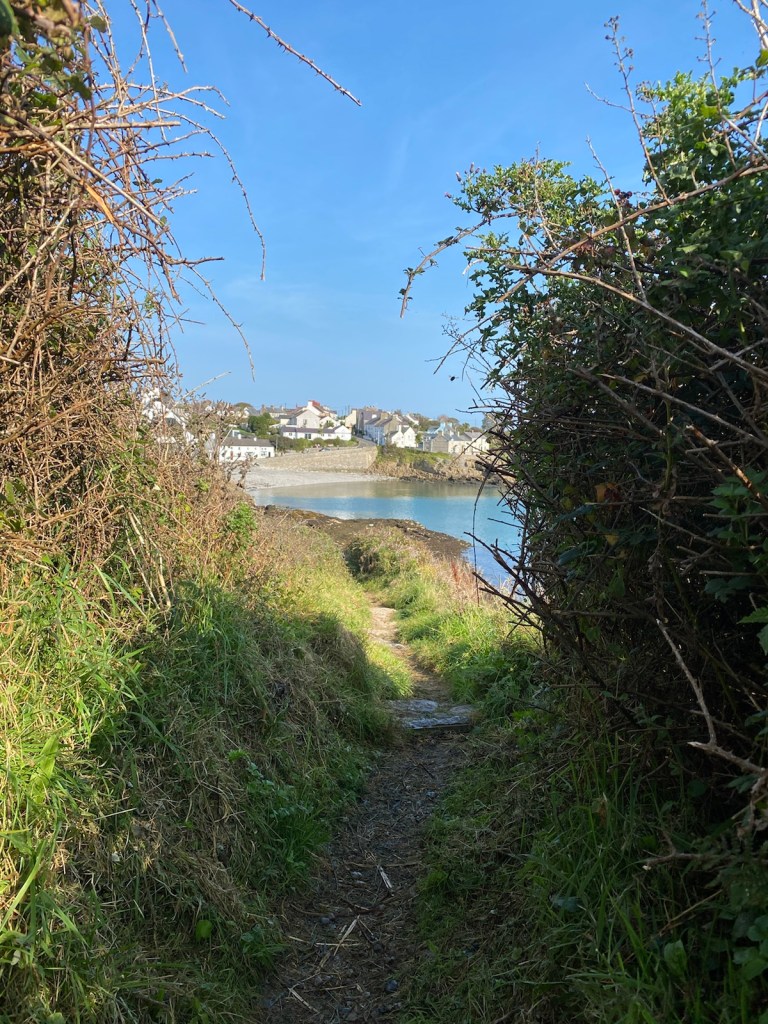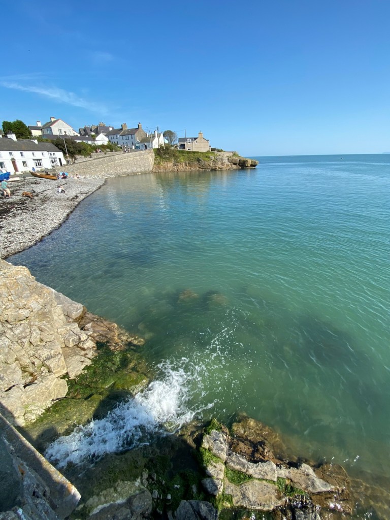 The walk was spectacular and the sun was shining, all was looking good. We even had one bay all to ourselves. About 30 minutes later we reached Moelfre. A very busy cafe was looking good but too busy so headed off to find the pub. Guess what. The pub was closed……..but that was only because it opened at midday and it was 11.50am. There were benches outside so we plonked ourselves down on one facing the sea and prayed they would do food, or if not they had a lot of crisps.