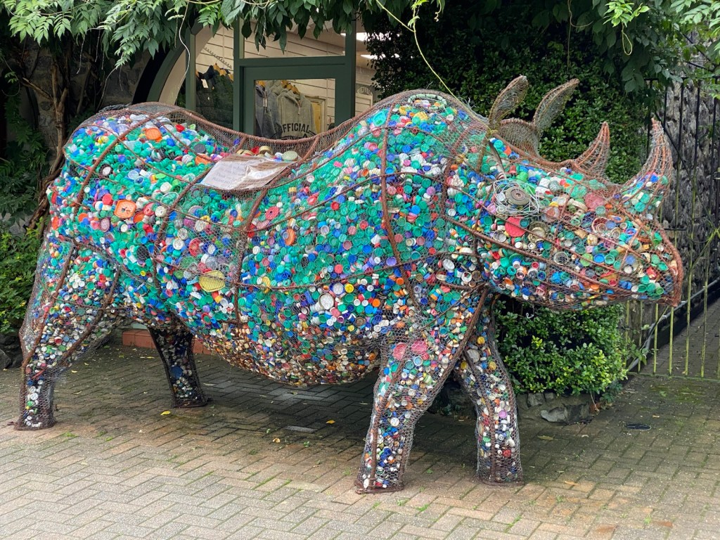 Betws Y Coed has a small station which we went to look at as there was some old carriages turned into a cafe in one of the sidings. On the platform were some great sculptures of animals filled with bottle tops. All something to do with saving the planet but very well done. The rhinoceros was my favourite. I also loved this sign outside one of the tea rooms. Obviously someone didn’t like it in there.